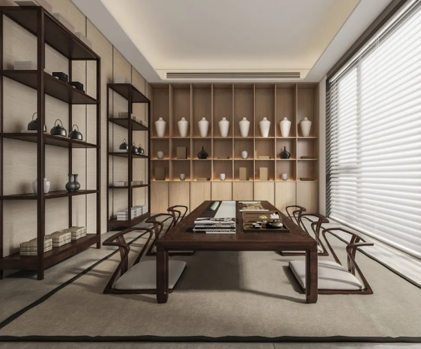 闲适的生活,就是在庸常的岁月中,寻找时间的空隙,品茗饮茶,以悟禅机。在禅修室与品茶室合二为一的空间里,方架与木柜的平衡,卷帙与座椅的曲线,连接起空间和谐的线条感。置身其中围炉夜话,茶香四溢间散漫着的涵养和雅致。